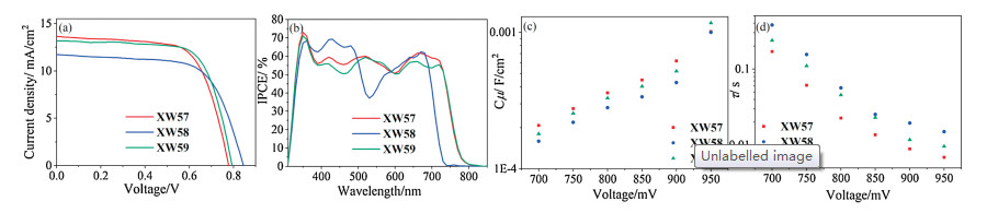 | Fig. 3. (a) J-V curves, (b) IPCE action spectra, plots of (c) Cμ and (d) t versus potential bias for DSSCs based on XW57-XW59. | |