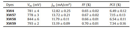Table 1 Photovoltaic parameters of the solar cells sensitized by XW4 and XW57-XW59 under simulated AM 1.5 G full sunlight (100 mW/cm2). The active area is 0.12 cm2. |