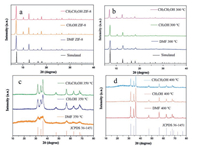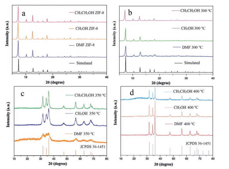 | Fig. 1. (a) The XRD pattern of the ZIF-8 precursors using different solvent. The XRD pattern of the products calcined at (b) 300 ℃, (c) 350 ℃ and (d) 400 ℃. | |