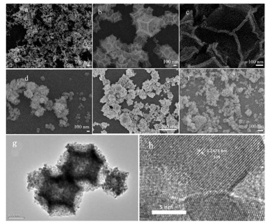 | Fig. 2. SEM image of samples ZnO: (a) ZnO-350-D; (b) ZnO-350-M; (c) ZnO-350-E; (d) ZnO-400-D; (e) ZnO-400-M; (f) ZnO-400-E. (g) TEM image of ZnO-350-M; (h) HRTEM images of ZnO-350-M (101) planes. | |