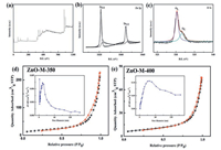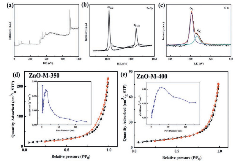 | Fig. 3. (a) The complete XPS spectra of ZnO sample. XPS spectra in the vicinity of the (b) Zn 2p and (c) O 1s peaks. Nitrogen adsorption-desorption isotherms and pore size distributions of (d) ZnO-M-350 and (e) ZnO-M-400 sample. | |