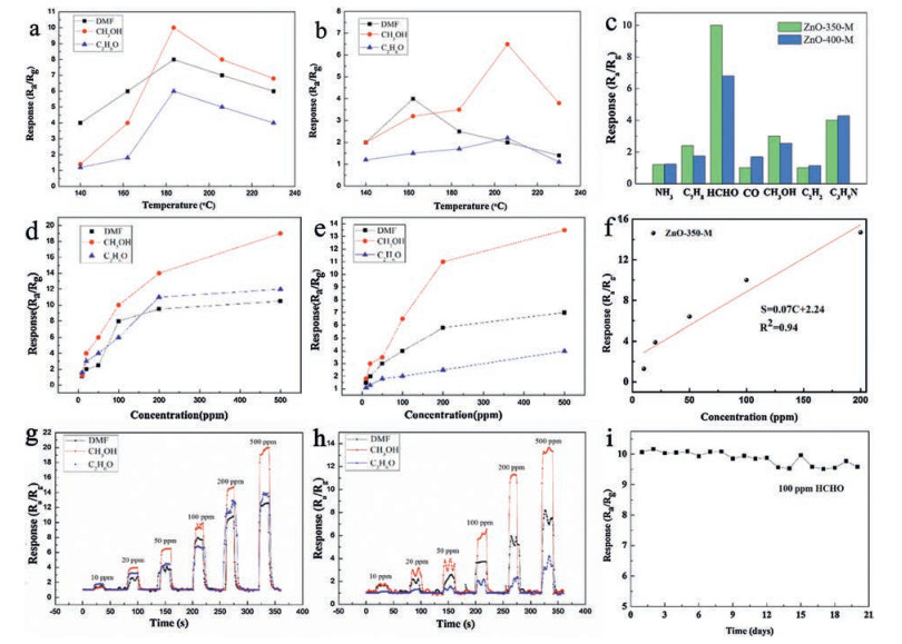 | Fig. 4. Response of sensors based on ZnO using different solvent calcined (a) at 350 ℃ and (b) at 400 ℃ to 100 ppm formaldehyde at different temperatures. (c) Responses of sensors based on ZnO calcined at different temperature using different solvent at 183 ℃ to 100 ppm various gases. Response of sensors based on ZnO calcined at (d) 350 ℃ and (e) 400 ℃ at 183 ℃ to formaldehyde at different concentration. (f) Responses of the ZnO-350-M sensor as a function of low formaldehyde concentration (10-200 ppm). Response and recovery time of sensors based on ZnO calcined at (g) 350 ℃ and (h) 400 ℃ at 183 ℃ to formaldehyde at different concentration. (i) Long-term stability of the ZnO-350-M based sensor to 10 ppm formaldehyde at 183 ℃. | |