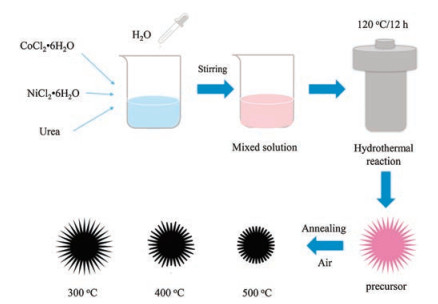 Fig. 2 displays the synthesis of NiCo2O4 microspheres. A hydrothermal approach is used to grow NiCo-containing microsphere precursor, which is converted to NiCo2O4 microspheres by thermal annealing. Depending on the annealing temperature, the microstructure of the final NiCo2O4 microspheres can be changed largely.