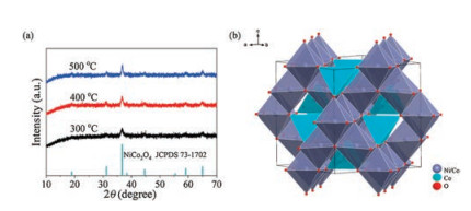 | Fig. 3. (a) XRD patterns of NiCo2O4 microsphere calcined at different temperature. (b) The atomic structure of NiCo2O4. | |