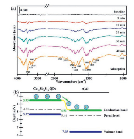 | Fig. 4. (a) DRIFT spectra of Cu12Sb4S13 quantum dots@rGO nanosheet composites at room temperature. (b) Schematic diagram of the bandgap structure for Cu12Sb4S13 quantum dots@rGO nanosheet composites. | |