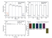 | Fig. 3. The gas sensing performance of Cu12Sb4S13 quantum dots@rGO nanosheet composites towards 250 ppm NH3 at room temperature: (a) Gas responses under various humidity; (b) Gas responses after repeatability test at relative humidity of 45%; (c) The long-term stability and (d) selectivity of Cu12Sb4S13 quantum dots@rGO nanosheet composites. | |