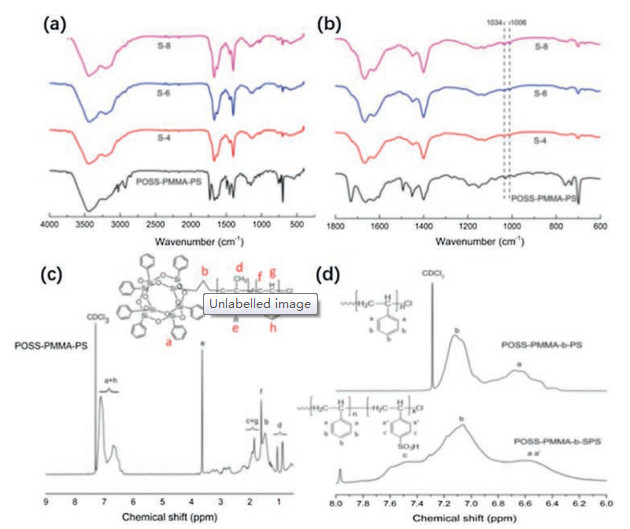 | Fig. 1. Structural characterization of POSS-PMMA-PS and POSS-PMMA-SPS. Comparison of FT-IR spectra based on POSS containing BCPs (a)wavenumber from 4000 cm-1 to 250 cm-1, (b) wavenumber from 1800cm-1 to 600 cm-1. 1H NMR spectra of (c) POSS-PMMA-PS and (d) POSS-PMMA-SPS. | |