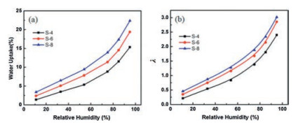 | Fig. 2. The water adsorption of POSS-PMMA-SPS with different sulfonation time as the function of RH (a).The effect of RH on hydration number (λ) at 30 ℃ for POSS-PMMA-SPS with different sulfonation time (b). | |