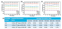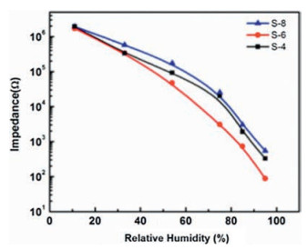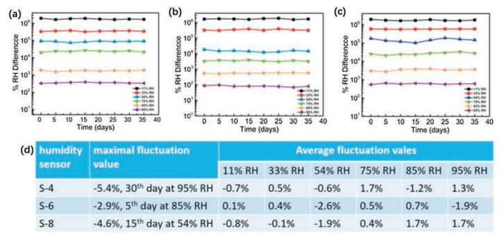 Long-term stability is another metric that must be met for the commercial humidity sensor applications. Since the exposure environment for humidity detection is complex, a fluctuating impedance at low and high humidity during the cycling will disqualify a sensor for use. The sensing performance of humidity sensors might significantly deteriorate after long term exposure, particularly when exposed to low and high RH. To evaluate the performance stability of the material, all three humidity sensors were exposed to 11% RH and 95% RH for 30 days and the impedance fluctuation of three humidity sensors is shown in Figs. 5a-c. In order to illustrate the stability of the humidity sensors, the fluctuation values (ΔZ) with time is given by ΔZ =(logZn-logZ0)/ logZ0× 100%, where logZn, logZ0 denote the impedance of each humidity sensor on the n and 0 day, respectively. Fig. 5d summarize the maximum and average fluctuation value of three humidity sensors. Taking S-6 humidity sensor for example, the calculation results show that the maximal fluctuation value is - 5.4% on 30th days at 95% RH, and the average fluctuation values of 11%, 33%, 54%, 75%, 85%, 95% RH in a month are 0.1%, 0.4%, -2.6%, 0.5%, 0.7% and -1.9%, respectively. The slight fluctuation of impedance proves excellent stability and durability of S-6 humidity sensor.