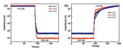 The third requirement of a good humidity sensor is a fast response and recovery time. As has been reported in previous publications, a slow recovery time was found to be a universal technical barrier for practical application of polymer-based humidity sensor. The desired response time of adsorption and recovery from desorption has been determined to be the achievement of 90% of the full impedance change when humidity changes from 11% to 95% and vice versa. As shown in Fig. 4a, the response time of the sensors was 15 s for S-4, 11 s for S-6, and 12 s for S-8. From the data shown in Fig. 4b, it can be seen that the recovery time for the various sensors was 88s for S-4, 80 s for S-6 and 100 s for S-8. Table 1 lists the sensing performance of the POSS- PMMA-SPS based humidity sensors and compares these results with reported literature values. These data show that the POSS- PMMA-SPS is a very promising material for use in humidity sensors since it provides relative low hysteresis and short response and recovery times.