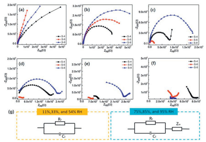 | Fig. 6. Nyquist curves and equivalent circuits (EC) model of POSS-PMMA-SPS humidity sensor with different degree of sulfonation: (a) 11% RH, (b) 33% RH, (c) 54% RH, (d) 54% RH, (e) 85% RH, (f) 95% RH; (g) EC models of humidity sensor under different RH. | |