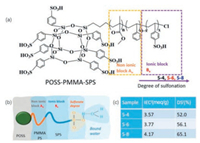 | Scheme 1. Chemical structure and physical property of POSS-PMMA-SPS with different sulfonation degree (S-4, S-6 and S-8). (a) Chemical structure; (b) schematic illustration of POSS-PMMA-SPS; (c) ion exchange capacity(IEC) and degree of sulfonation (DS) of different BCP. I: The IEC and DS value was calculated through titration as indicated in Supporting information. | |