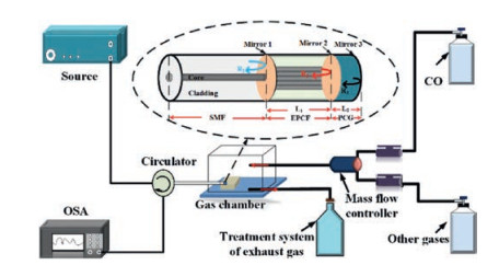 Schematic diagram of the experimental setup is shown in Fig. 1. Sensor is placed in the glass gas chamber that can introduce the CO gas effectively. Interference spectra were monitored by using OSA. One air valve was used to adjust the concentration of the target gas and the other valve was designed to export the gas from the chamber. The exhaust gas was introduced into the modified activated carbon bottle at the gas outlet to ensure safety and avoid air pollution.