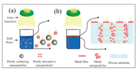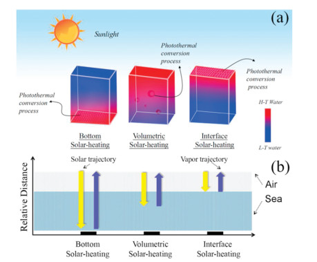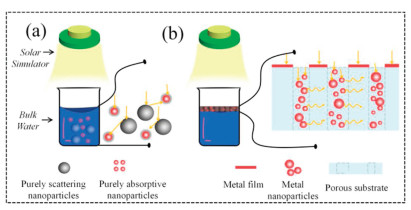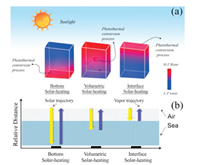 | Fig. 4. (a) Effective localized evaporation in volumetric solar heating of metal-based PVGD by separating the light absorption center and the scattering center. (b) Effective localized evaporation in interface solar heating of metal-based PVGD by assembling a porous metal template. | |
