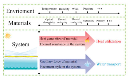 Notably, this formula is only an empirical formula that qualitatively considers the factors affecting the evaporation capability of the entire PVGD. It does not mean that each factor is numerically related. Here, E.C. refers to the evaporation capability of this metal-based PVGD; K is a environment constant, determined by the temperature, humidity, wind, pressure of the environment. According to previous articles, different work environments often have a significant impact on evaporation efficiency, so these parameters remain constant for a unified PVGD [1-4]; σi is an intrinsic factor determined by the nature of material, including wettability, porosity, thermal conductivity, optical absorptivity, and thermal emissivity, etc. These characteristics are critical to the energy analysis and simulation of the entire metal-based PVGD; σh is a heat utilization factor, which is mainly determined by the photothermal conversion capability of the material and the total thermal resistance of the system. σW is the water transport factor, which is determined by the capillary force of the material and the way the material in the system is in contact with water. This reminds us that we cannot directly judge the water transport capacity (or capillary driving force) of PVGD by the materials surface wettability and porosity of the material. Understanding completely the transport process behavior of water molecules in confined spaces is related to material structure and properties typically used for structural characterizations such as pore dimension, surface texture, and tortuosity.