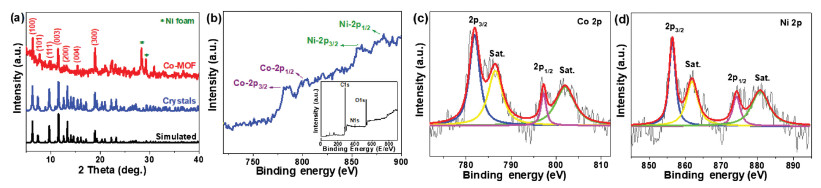 | Fig. 2. (a) XRD patterns of the Co-MOF and (b-d) XPS spectra of the as-synthesized Co-MOF sample: (b) The full survey scan spectrum, (c) Co 2p, (d) Ni 2p. | |