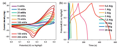 | Fig. 4. (a) CV curves of Co-MOF at different scan rate in 3 mol/L KOH; (b) the charge/ discharge curves of Co-MOF at different current density. | |