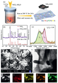 | Fig. 1. (a) Schematic of synthesis of the NiS2/rGOnanocomposite. (b) XRD patterns and (c) Raman spectra of NiS2/rGO nanocomposite. (d) SEM image of NiS2/rGO. (e, f) TEM image and corresponding element mappings of NiS2/rGO. | |