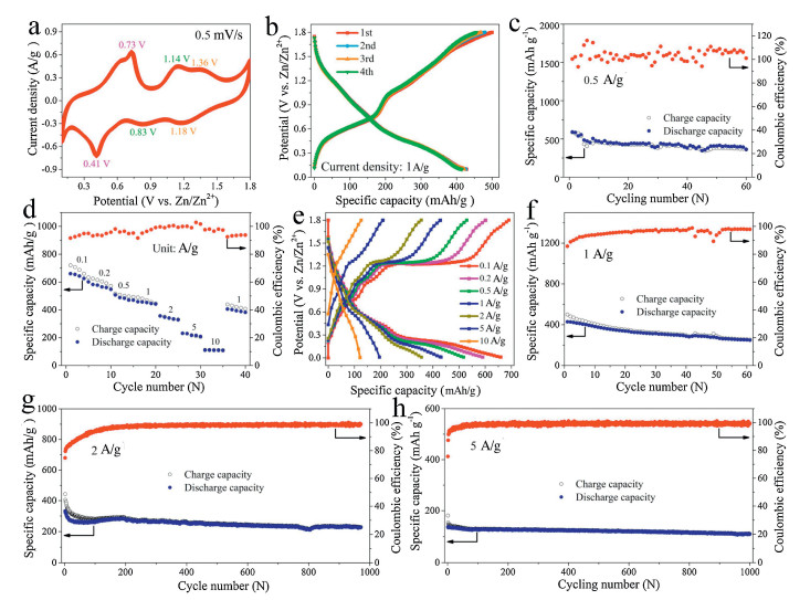 | Fig. 3. Electrochemical performance of the hybrid Zn battery with cathode of MnFe2Co3O8 NDs/FGS: (a) Representative CV curve at 0.5 mV/s in the voltage range of 0.1-1.8 V vs. Zn2+/Zn. (b) GCD curves and (c) galvanostatic cycling performance at 0.5 A/g. (d) Rate capacities at current densities from 0.1 A/g to 10 A/g, and (e) the corresponding GCD curves. (f) Galvanostatic cycling performance at 1 A/g. Long galvanostatic cycling performance at (g) 2 A/g and (h) 5 A/g. | |