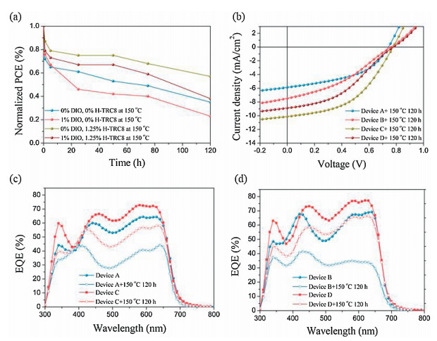 In the previous studies, solvent additives, such as 1, 8-diiodooctane (DIO) is often used in OSCs to improve PCE, but it seriously reduce the device stability [28]. Once the residual DIO is evaporated from the active layer during the operation process, domain size in OSCs should become smaller. This makes the well-connected domains lose their connection and accelerates morphological degradation process. In order to investigate the effect of H-TRC8 on device stability, the PCEs and J–V characteristics were measured and are shown in Figs. 7 a and b, for the PBDB-T/PC60BM based OCSs at various DIO and HTRC8 doping ratios after heating at 150 ℃ for 120 h. The PCE values of the device A without any additives, the device B with 1.0 vol% DIO, the device C with 1.25 wt% H-TRC8 and the device D with 1.0 vol% DIO and 1.25 wt% H-TRC8 decay 65%, 77%, 43% and 62% in comparison with their original values, respectively. As shown in Figs. 7c and d, the variation tendency of EQE is similar to that of PCE. It indicates that introduction of H-TRC8 into the PBDB-T/PC60BM active layer is available to efficiently suppress PCE roll-off and increase device stability. We consider that shrinkage of the PBDB-T domains should become difficult owing to the effect of H-bonds between H-TRC8 and PBDB-T in the devices. As a result, the PBDB-T/PC60BM OSCs with H-TRC8 have better device stability.