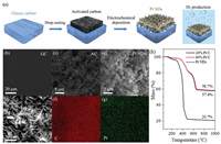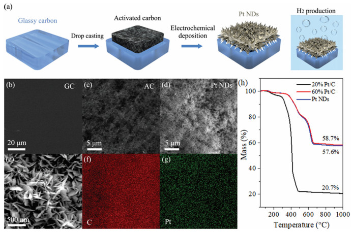 | Fig. 1. (a) Scheme of the preparation process of Pt NDs catalyst for hydrogen production. (b–d) SEM top-view images of glassy carbon, activated carbon, and Pt NDs. (e) Regional enlarged view of nanodendrite-structure of (d). (f, g) EDS mapping of element distribution of C and Pt. (h) TGA curves of 20% Pt/C, 60% Pt/C and Pt NDs. | |