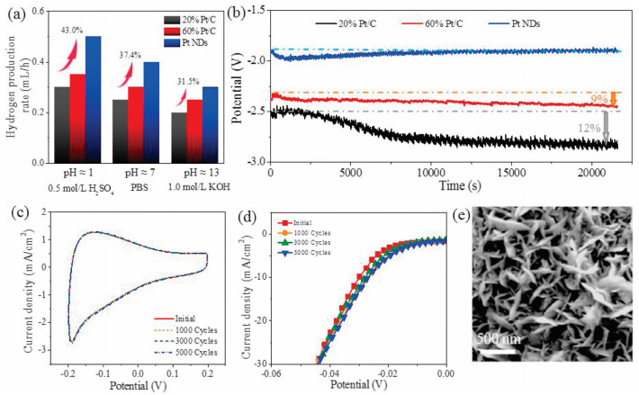 | Fig. 4. (a) Hydrogen production rates of 20% Pt/C, 60% Pt/C and Pt NDs in acid, neutral and basic solution, respectively. (b) Results of 6 h galvanostatic test at a constant current density. (c) CV curves of Pt NDs under 1000, 3000 and 5000 cycles CV scanning. (d) HER polarization curves of Pt NDs after CV scanning. (e) SEM images of Pt NDs after electrochemical stability test. | |