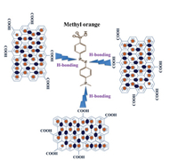 Composites of graphene show enhanced removal performances by introducing supplementary functional groups, which may generate new adsorptive interaction with dye molecules i.e., hydrophobic interaction, H-bonding, van der Waals interaction, Lewis acid-base interaction, etc. For instance, Das et al. [197] fabricated Gd2O3/Bi2O3@GO composites and applied to remove methyl orange (MO) from aqueous solution. The maximum adsorption capacity was recorded as 544 mg/g, which was comparatively higher than individual Bi2O3@GO (308 mg/g) and Gd2O3@GO (392 mg/g). The H-bonding between oxygenated functional groups of Gd2O3/Bi2O3@GO and nitrogen-containing group of MO was specified as the principal adsorption mechanism. Fig. 4 illustrated the formation of H-bonding between Gd2O3/ Bi2O3@GO and MO. Heidarizad et al. [198] reported a high removal rate of MB by GO/ MgO composites. Due to strong electrostatic interactions, the composites showed high adsorption capacity as 833 mg/g at high pH, which was comparatively higher than pure GO and MgO.