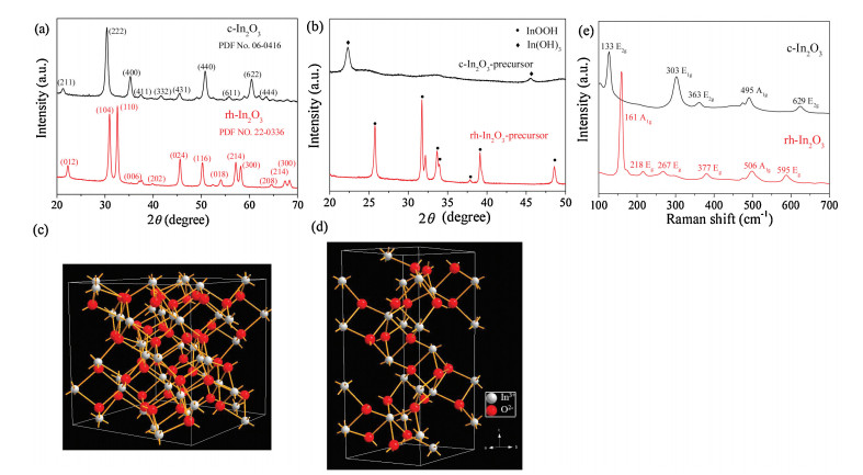 | Fig. 1. Structural characterizations of c-In2O3 and rh-In2O3, (a) XRD, (b) XRD of precursor before calcination. Diagrammatic sketch of c-In2O3 (c) and (d) rh-In2O3, (e) Raman spectra. | |