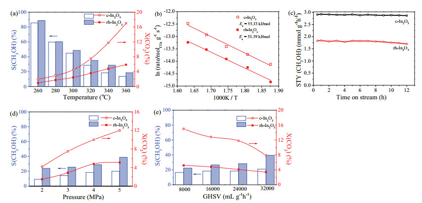 The space-time yield (STY) of methanol over the catalysts was also shown in Fig. 2c. C-In2O3 generated about 3.0 mmol g-1 h-1 CH3OH at 340 ℃, which was higher than 1.8 mmol g-1 h-1 of rh-In2O3. The stability of both catalysts showed slight deactivation after 12 h reaction on stream. The XRD patterns of used catalysts was shown in Fig. S8 (Supporting information). In compared with Fig. 1, the intensities of peaks in both catalysts were decreased. However, the diffraction peaks of both samples were still sharp and intense, indicating their highly crystalline nature. No impurity peaks were observed, confirming the high purity of the used catalysts. Moreover, the transformation between c-In2O3 and rh-In2O3 was not observed, which showed the structural stability under reaction condition. Moreover, the influence of experimental conditions on CH3OH selectivity was also evaluated (Figs. 2d and e), which showed higher gas hourly space velocity (GHSV) and pressure were beneficial for CH3OH selectivity. And rh-In2O3 had higher CH3OH selectivity during all experimental conditions.
