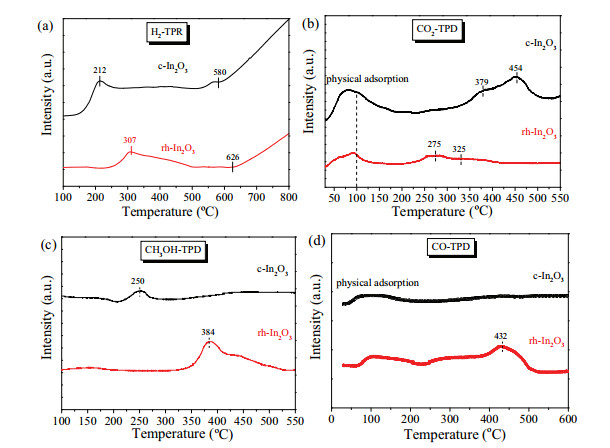 However, due to the thermodynamic restrictions, CO still was the main product at high temperature. With the higher reducibility and basicity, c-In2O3 showed higher CO2 conversion and CH3OH productivity than rh-In2O3. And the adsorbed CH3OH molecules desorbed at lower temperature than that of the adsorbed CO molecules on rh-In2O3. In contrast, CO was more easily desorbed from the surface than CH3OH on c-In2O3. So the rh-In2O3 showed higher CH3OH selectivity during CO2 hydrogenation compared with the c-In2O3.