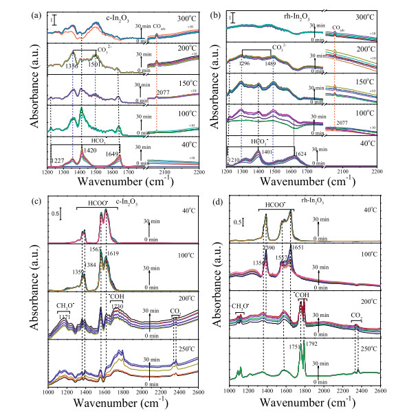 | Fig. 4. In-situ DRIFTS spectra of CO2 adsorption and conversion over the catalysts, (a) c-In2O3 and (b) rh-In2O3. HCOOH adsorption and conversion over the catalysts, (c) c-In2O3 and (d) rh-In2O3. | |
