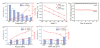 | Fig. 2. Catalytic performance of the catalysts. (a) catalytic performance at the reaction temperatures from 260 ℃ to 360 ℃ with H2/CO2 = 4/1, 4 MPa and 16, 000 mL g-1 h-1. (b) Arrhenius plot for CO2 conversion. (c) Evolution of the methanol STY with time on stream. (d) The effect of pressure on CO2 hydrogenation. The reaction condition: 340 ℃, H2/CO2 = 4/1 and 16, 000 mL g-1 h-1. (e) The effect of GHSV on CO2 hydrogenation. The reaction condition: 340 ℃, H2/CO2 = 4/1 and 4 MPa. | |