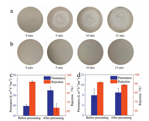 | Fig. 4. (a, b) Photographs and (c, d) separation performance of (a, c) the GO and (b, d) PDA-GO membranes after external scratching by mechanical stirring. | |