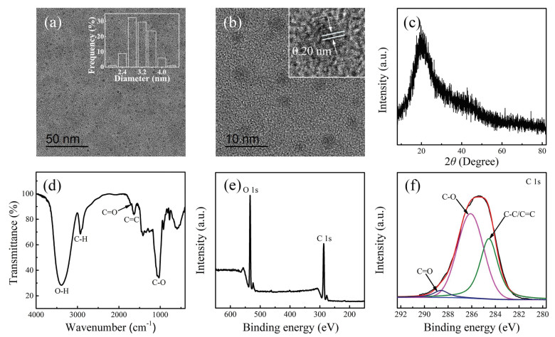 | Fig. 1. (a) TEM image and size distribution of r-CDs (inserted image). (b) HRTEM image of r-CDs. (c) XRD pattern of the synthesized r-CDs. (d) FTIR spectra of r-CDs. (e) XPS spectrum of r-CDs and (f) high-resolution spectra of the C 1s. | |