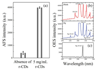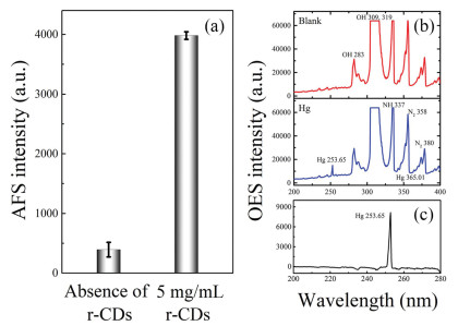 | Fig. 2. (a) Atomic fluorescence intensity from r-CDI-CVG-AFS with 20 μg/L Hg2+ in the absence/presence of r-CDs. (b) Emission spectra generated by r-CDI-CVG-μPD-OES without/with Hg2+, and (c) mercury emission spectra after calibration. | |