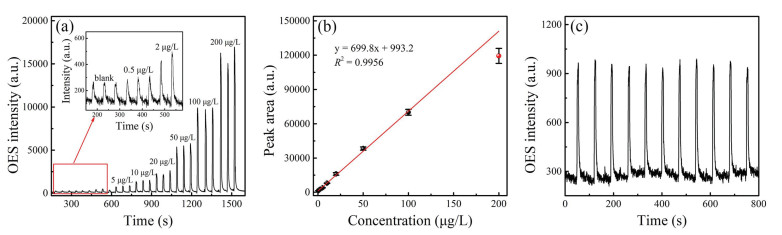 | Fig. 3. (a) Hg emission signal profiles of r-CDI-CVG-μPD-OES. (b) Calibration curves established using r-CDI-CVG-μPD-OES. (c) Hg emission signal profiles of 11 replicate measurements of 5 μg/L Hg2+ ions. | |