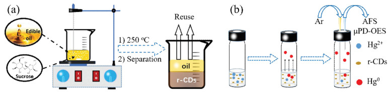 | Scheme 1. (a) Synthesis of r-CDs via the oil-bath method. (b) The generation and analysis process of volatile Hg0. | |