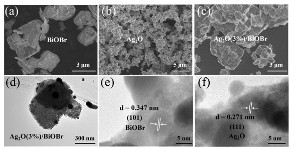 | Fig. 1. SEM images of BiOBr (a), Ag2O (b) and Ag2O(3%)/BiOBr (c). TEM images of Ag2O(3%)/BiOBr (d), HRTEM images of Ag2O(3%)/BiOBr (e, f). | |
