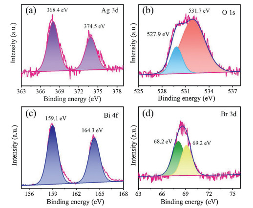 | Fig. 2. High-resolution XPS spectra of (a) Ag 3d, (b) O 1s, (c) Bi 4f and (d) Br 3d. | |