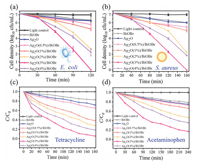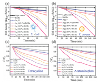| Fig. 3. (a) Inactivation efficiency against E. coli (107 cfu/mL) with photocatalysts (100 μm/mL). (b) Inactivation efficiency against S.aureus (107 cfu/mL) with as-prepared photocatalysts (100 μm/mL). (c) Removal efficiency against tetracycline (60 μm/mL) with as-prepared photocatalysts (100 μm/mL). (d) Removal efficiency against acetaminophen (5 μm/mL) with as-prepared photocatalysts (100 μm/mL). | |