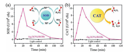| Fig. 4. SOD (a) and CAT (b) activities during photocatalytic disinfection process against E. coli (108 cfu/mL). | |