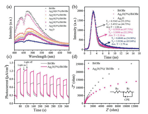 | Fig. 5. (a) Photoluminescence (PL) spectra of the as-prepared samples. (b) Time-resolved PL decay spectra. (c) Transient photocurrent and (d) EIS Nyquist plots of BiOBr and Ag2O(3%)/BiOBr. | |