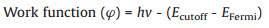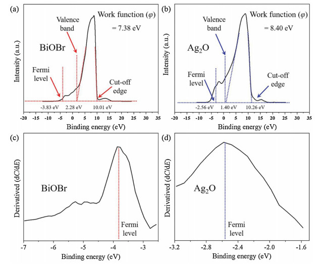 Ultraviolet photoelectron spectroscopy (UPS) spectra was applied to investigate the valence gap and work function of BiOBr and Ag2O. As shown in Fig. 6, valence gap with the edge of maximum energy of BiOBr and Ag2O was 2.28 and 1.40 eV, respectively. UPS photoelectron spectroscopy has a threshold value of Ecutoff at the low kinetic energy end, which corresponds to the cut-off of secondary electron emission. Based on Einstein law, work function and Ecutoff are related as follow (Eq. 1):