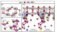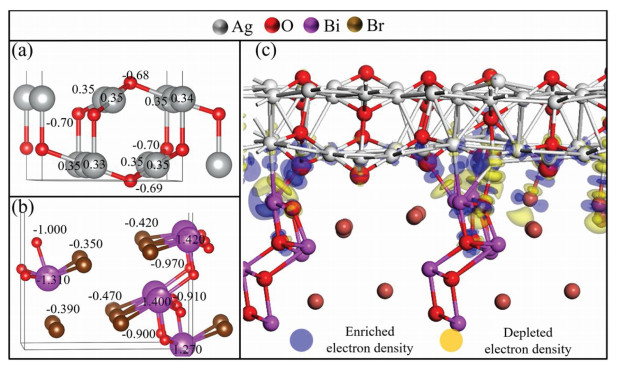 | Fig. 7. (a) Optimized Ag2O (111) surface and the calculated Mulliken charge population. Silver and red balls represent Ag and O atoms, respectively. (b) Optimized Bi-terminated BiOBr(101) surface and thecalculated Mulliken charge population. Purple, brown and red balls represent Bi, Brand O atoms, respectively. (c) Optimized Br-terminated BiOBr (101) surface. Purple, brown and red balls represent Bi, Br and O atoms, respectively. The total energy of this structure is 4 meV higher than the structure in (b). | |