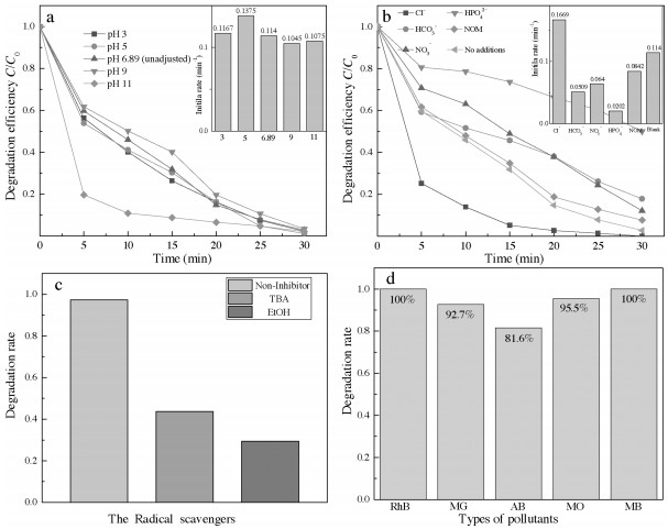 | Fig. 4. Effect of different initial reaction pH (a), extra material addition (b), inhibition experiments (c) and various contaminants degradation (d) in the system of Fe2O3/Mn2O3 composite activated PMS, the inset was the corresponding initial rate (Reaction conditions: PMS concentration = 0.8 g/L, catalyst dosage = 0.6 g/L, TTZ concentration = 0.01 g/L, inhibitor dosage = 50 mmol/L, various contaminants concentration = 0.01 g/L, reaction temperature = 25 ℃ and initial pH 6.89 (unadjusted)). | |