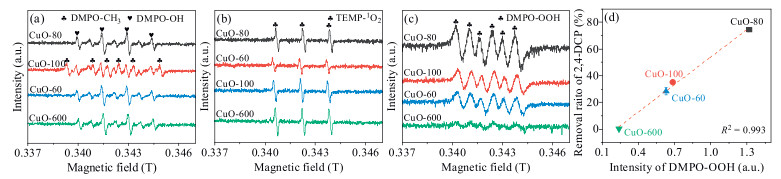 | Fig. 1. The EPR signals of the (a) DMPO-CH3 and DMPO-OH (aqueous solution), (b) TEMP-1O2 (aqueous solution), (c) DMPO-OOH (methanol media) adducts and (d) the relationship between the intensity of DMPO-OOH and the removal ratio of 2, 4-DCP in the four CuO/O2 systems adopting CuO-80, CuO-100, CuO-60 and CuO-600. Conditions: [CuO] = 2 g/L, [DMPO] = 50 mmol/L, pH 6.0 and 25 ℃. | |