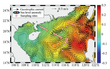 | Fig. 4. Sea level anomaly (unit: m) and geostrophic current anomaly (unit: m/s) of the northeastern South China Sea. | |