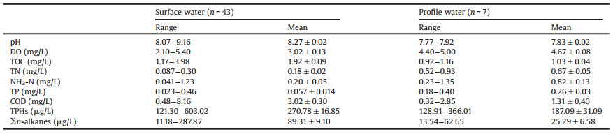 The water chemistry parameters were determined by standard methods including pH (on site), dissolved oxygen (DO, on site), chemical oxygen demand (COD, GB11892-89), total organic carbon (TOC, GB13193-91), total phosphorus (TP, GB11893-89), total nitrogen (TN, GB1189 4-8 9) and ammonia nitrogen (NH3-N, GB7479-87). Total petroleum hydrocarbons (TPHs) including both alkanes and aromatics in water were measured from volatile (TPHC6-C9, HJ893-2017) and extractable (TPHC10-C40, HJ894-2017) fractions using gas chromatography-flame ionization detector (GCFID) technology. The concentration of each n-alkane (C10-C40) was also determined. The details for the analysis of petroleum hydrocarbons are provided in Text S1 (Supporting information). The gas chromatograms (C10-C40) of all the samples are provided in Supporting information.