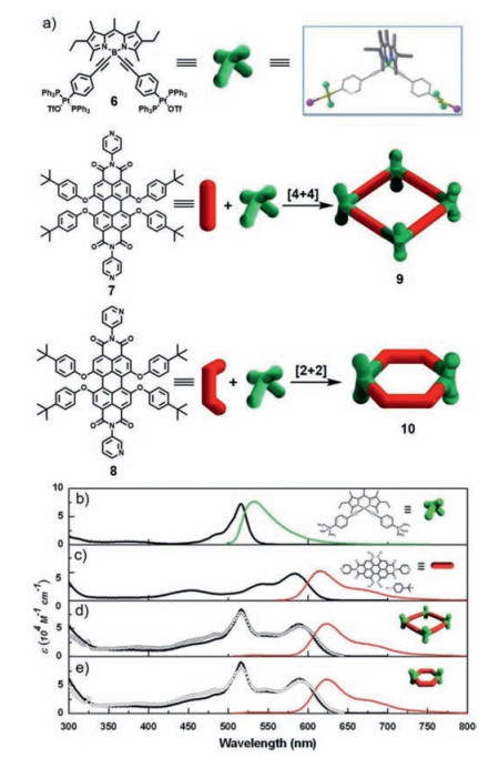 Recently, Pistolis et al. prepared the rhombic metallacycle 9 and hexagonal metallacycle 10 by stirring the mixtures of boron dipyrromethane (BODIPY)-containing diplatinum acceptor 6 and 180° perylene bisimide (PBI)-containing donor 7 or 120° perylene diimide-containing donor 8, respectively, in ClCH2CH2Cl in a 1:1 stoichiometric ratio at ambient temperature for 1 h (Fig. 2a) [85]. Upon excitation of dilute solutions of metallacycles 9 and 10 in ClCH2CH2Cl at 500 nm (the main absorption band of the BODIPY subunit 6), the intense fluorescence of 6 almost totally disappeared and was replaced by the fluorescence spectrum of the PBI unit 7 (Figs. 2b-e). The fluorescence emission spectra of both metallacycles 9 and 10 exhibited the typical PBI emission with the maximum at 623 nm. The results revealed the presence of efficient energy transfer from the BODIPY units to the PBI units of the metallacycles 9 and 10. Moreover, the energy transfer efficiency of these metallacycles 9 and 10 were determined to be approximately 97% as a basis of the comparison of the quantum yields of the donor moiety in the metallacycles and free form.