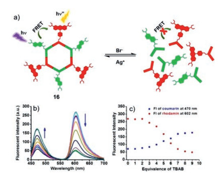With the aim of investigating the structural effects, such as the relative position and distance of donor and acceptor fluorophores, on FRET, the short donor ligand 14 and coumarin endo-functionalized ligand 15 were designed and prepared. Correspondingly, metallacycles 17 and 18 were constructed through selfassembly of donor ligands 14 and 15 with acceptor ligand 12, respectively. As expected, energy transfer efficiency (ΦET) between coumarin and rhodamine in metallacycles 16, 17 and 18 was calculated to be 49.18%, 73.52% and 56.74%, respectively. Moreover, the rate constant for self-assembly of metallacycles 16, 17 and 18 was determined to be 1.09 × 10–3, 5.67 × 10–4 and 7.80 × 10–4, respectively. Furthermore, the dynamic ligand exchange between metallasupramolecular architectures, the anion-induced disassembly and reassembly of metallacycles, and the stability of metallasupramolecular structures in different solvents were comprehensively investigated by FRET. For instance, the gradual addition of 6.0 equiv. of Br- into the solution of metallacycle 16 caused a remarkable decrease in emission related to rhodamine accompanied by an increase in emission corresponding to coumarin (Fig. 4), which indicated the disassembly of metallacycle 16 with the addition of Br- due to the stronger nucleophilicity of Br- to the platinum atom than that of pyridine unit. On the contrary, the addition of 6.0 equiv. of Ag+ into the halogenated solution of metallacycle 16 induced the reassembly of 16 as evidenced by the reoccurrence of the FRET process. Moreover, realtime monitoring of the FRET signals of metallacycle 16 in different solvents such as dichloromethane, acetone, and acetonitrile showed that metallacycle 16 displayed good stability in dichloromethane and acetone while instability in acetonitrile since acetonitrile featured the stronger binding ability to platinum atoms than pyridine. Therefore, this study presented the first successful example on real-time monitoring the process and dynamics of coordination-driven self-assembly through the FRET technique, which undoubtedly deepened the understanding of the coordination-driven self-assembly process and mechanism.